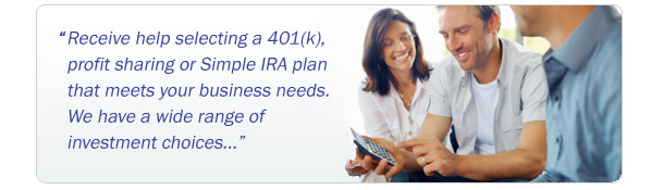 Receive help selecting a 401(k), profit sharing, or Simple IRA plan that meets your business needs. We have a wide range of investment choices, including the ability to work with your existing advisor.